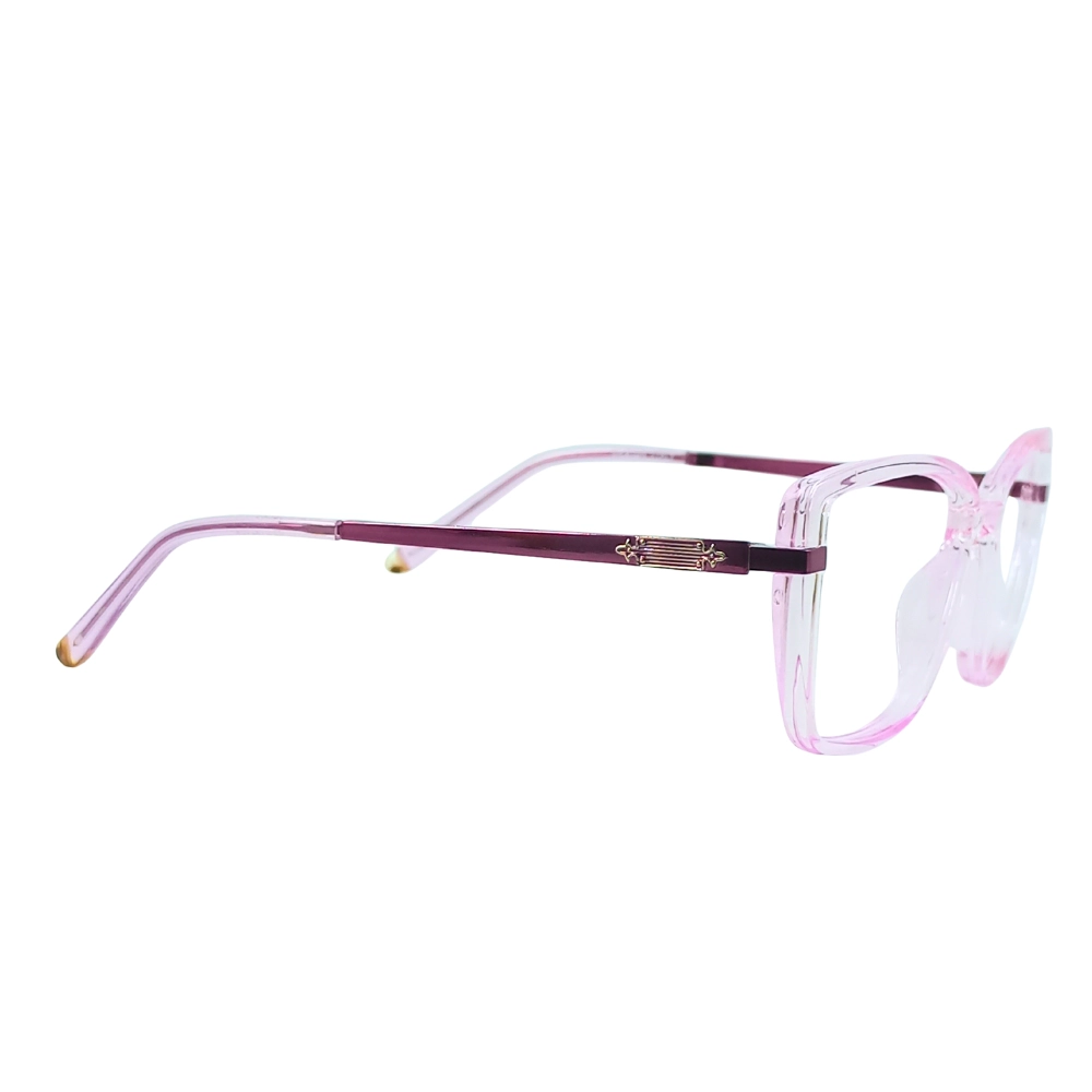 Experience refined elegance with these Clear Pink Square Eyeglasses featuring striking plum-colored temples and gold decorative accents. The translucent pink acetate frame radiates a fresh, contemporary vibe, while the robust plum temples offer a deep, eye-catching contrast. Golden embellishments at the hinge elevate the overall sophistication and create a premium finish.